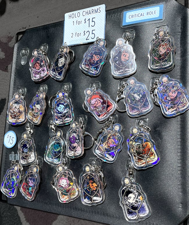 Printed on and sandwiched between clear acrylic with a holographic film (sparkles in rainbows!), comes as a lobster clasp keychain.