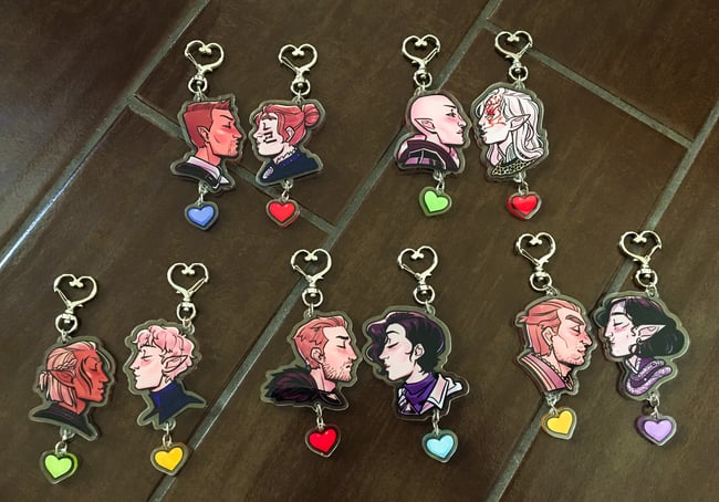 Printed on and sandwiched between clear acrylic with a linking heart charm. Comes with a heart-shaped lobster clasp keychain.